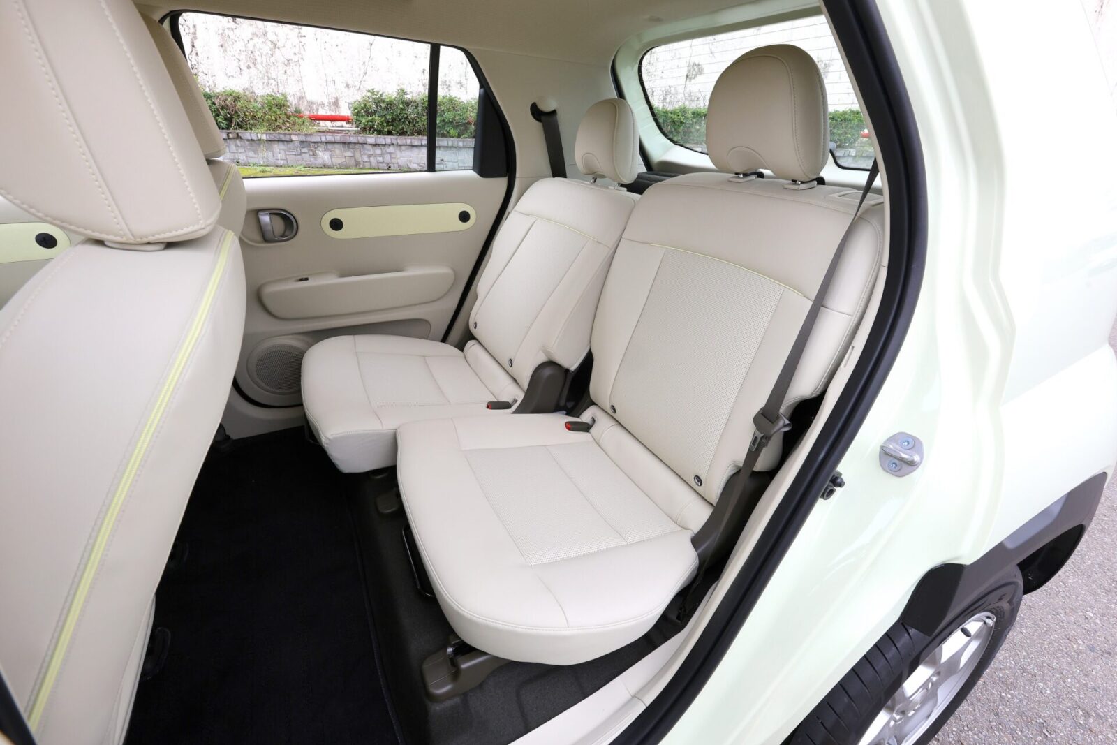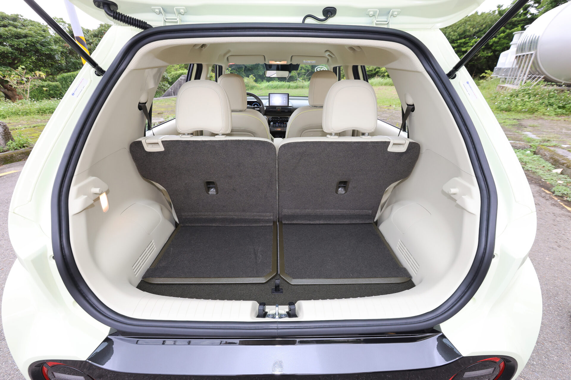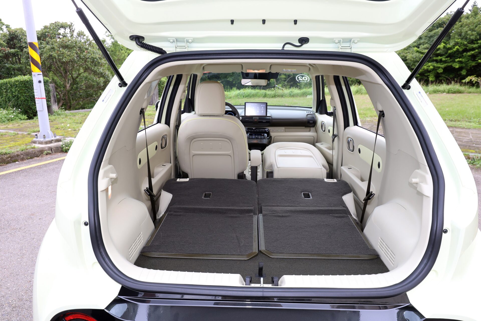 以175cm的成人實際乘坐,在後座椅退到最後之下,膝部離前椅背約有超過2個拳頭空間,即便後座推至最前端,膝部也仍約有1個拳頭的表現,而頭部也在高頂設定下離頂篷約有1.5個拳頭距離,再加上可大幅調整的椅背角度,因此無論是寬敞度或舒適性都超乎想像的出色。至於行李廂容積在標準4人乘坐下,可於238~351公升之間變化(入門車型EV400-A因後座無法滑移固定為238公升),加上5/5分離的後座椅背傾倒後即能擴增至1059公升。除此之外,Inster兩張前座的椅背也能完全打平,使座艙的空間最大化,便於置放長型物品,甚至可擺放充氣床墊來個車宿也不成問題,這可是絕大部分的迷你小車所無法辦到的特殊技能!