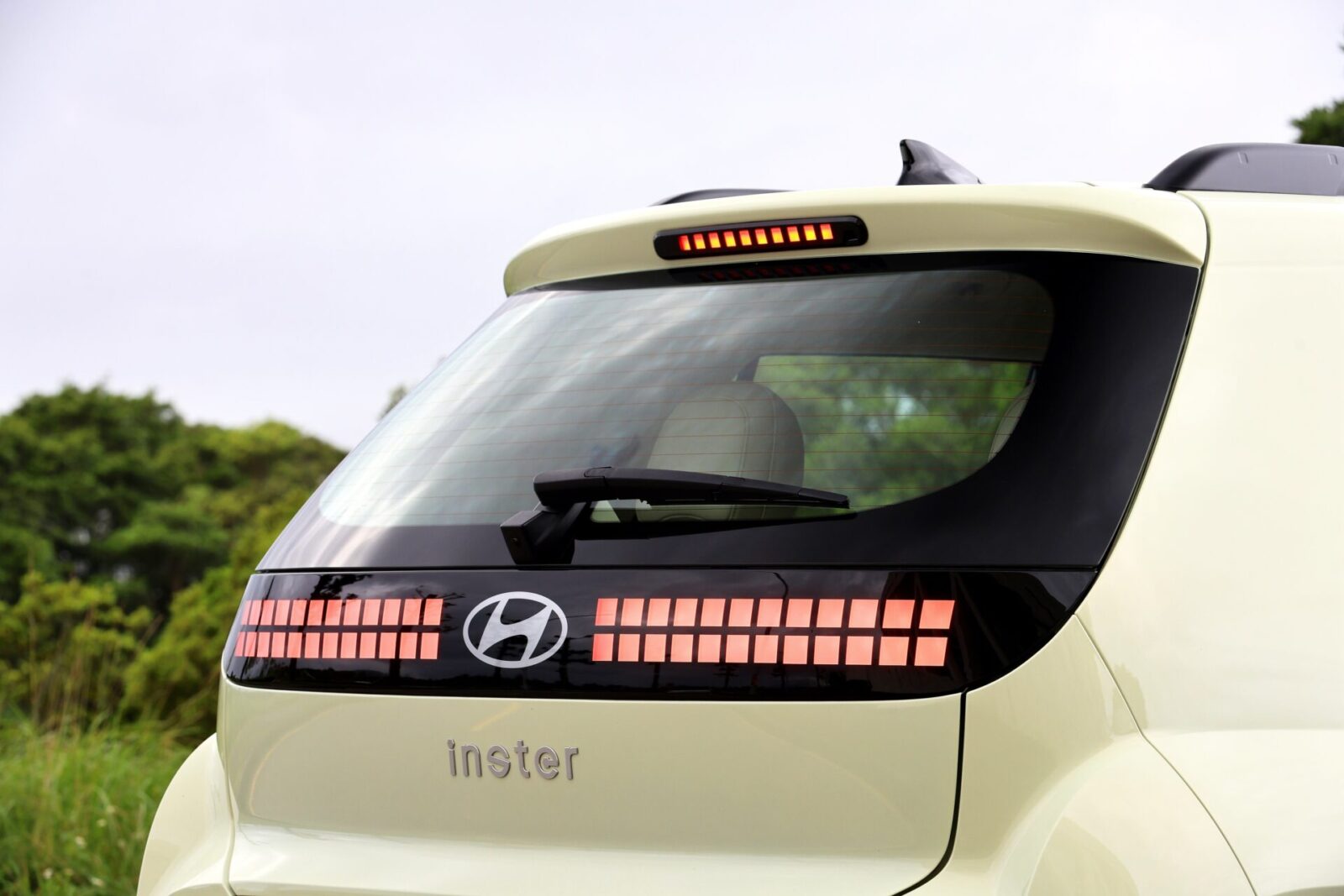 車側造型同樣是視覺焦點,除了擁有個性化風格的消光黑塗裝A柱以及具實用性的雙色橋式車頂行李架之外,還有獨特的隱藏式後門把以及外突輪拱線條與專屬15吋幾何十字低風阻綠圈,搭配極短的車身前/後懸比例,營造出掀背小車才有的活潑衝勁與熱情。至於車尾造型則完全呼應車頭的設計邏輯,其中最獨特亮眼的就是與尾門玻璃融為一體的「Pixels LED矩陣光幕尾燈」,不僅夜間辨識度高,更展現出Ioniq電動系列專屬的家族風格。此外,也同樣擁有Pixels數位像素造型的後保桿以及鑲嵌紅色反光飾板的圓環設計,甚至保桿下方的霧銀梯形框飾也與車頭如出一轍,因此Inster在以像素光影語彙貫穿全車的設計下,盡展獨特且極具前衛科技感的潮流風貌。