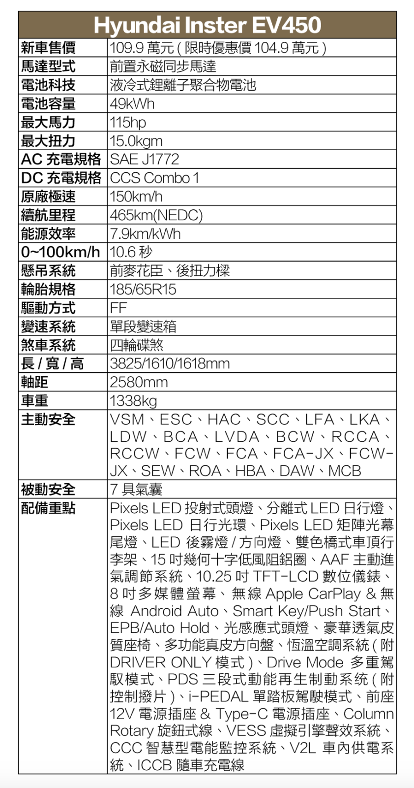 Inster的確是一部充滿魅力的迷你純電掀背車款,無論是吸睛度十足的外觀造型,還是已屬中上水準的配備豐富度與高規格的安全科技,再加上可完全打平的前後座椅機制以及超乎想像的寬敞空間和變化機能等,皆讓此車顯得十分超值,尤其輕快好開又好鑽的駕馭特性,再加上電動車相對更為友善的使用成本,讓Inster的吸引魅力再加分。再者,最重要的一點就是以現行國內電動車市場而言,Inster打出89萬~105萬元限時優惠價的入主門檻,讓它成為了最容易入手的進口電動車款,這對於有意跨足電動車的買家來說,無疑是最具吸引力的。