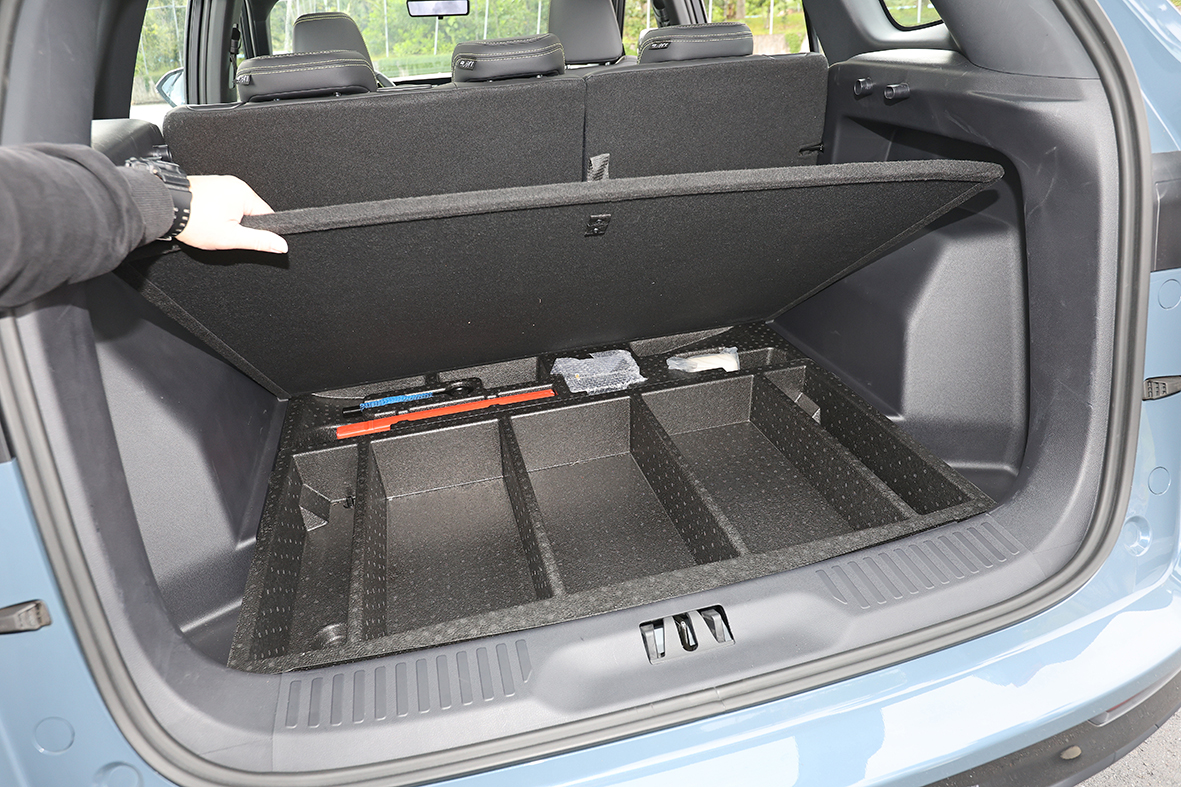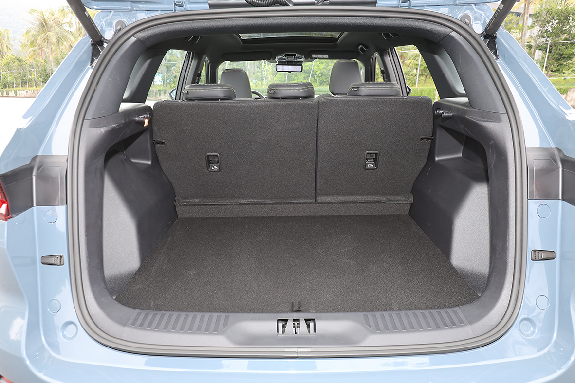 Territory的車身長/寬/高尺碼與軸距分別為4685/1935/1706mm以及2726mm,相較現行國內販售的Kuga,除了包含車長、車寬與車高皆明顯放大之外,軸距也增加了16mm,這也造就了Territory更為出色的車艙與行李廂乘載空間。以雙前座來說,除了座椅整體乘坐的舒適性表現相當不錯外,也誠意的加上實用的電動調整與通風功能,值得讚賞。而後座以175cm成人實際乘坐,膝部與頭部空間還分別擁有約2.5個與1個拳頭的距離,寬敞度非常好,即便後座無法前後移動且椅背角度無法調整,但坐起來還算舒適不會有過挺的感覺,尤其受惠於達1935mm的車寬,帶來相當寬廣的橫向空間表現,儘管後座滿載3人,還不致於發生摩肩擦踵的情況,再加上後座底板採平整化設計,不僅進出更為方便,也提升了後座乘坐時的舒適性。