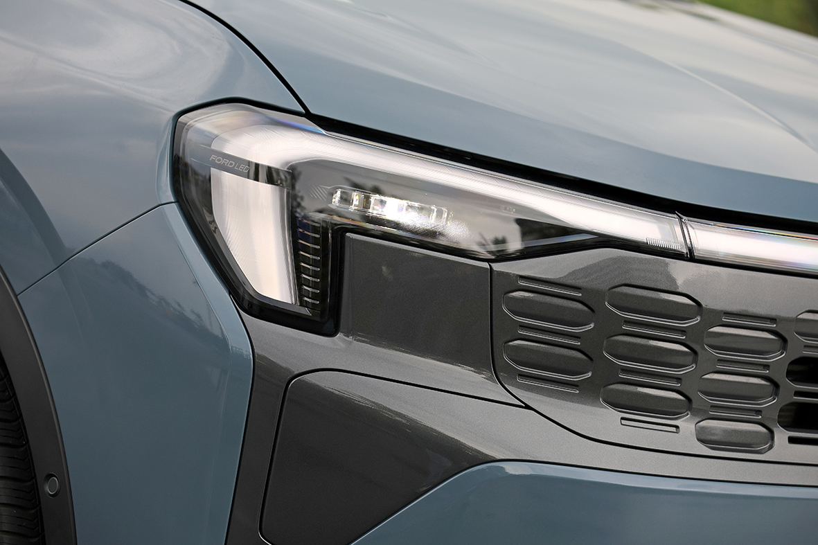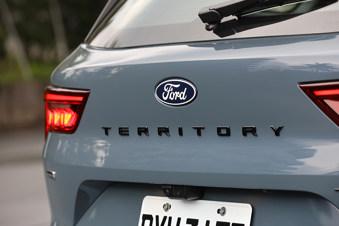 在外觀造型部分,Territory採用品牌新世代的「Bold Energetic」設計語彙,並融合了Ford家族經典硬派自信設計元素,諸如Bronco的貫穿式寬幅格柵的水箱護罩與越野式的方正引擎蓋,以及經典車款F-150的光斧形LED日行燈與梯形前保桿,再加上達1015mm的LED貫穿識別燈,以及源自於Mustang的經典「三柱式流光序列尾燈」等,為Territory造就了既霸氣又前衛科技的外觀造型。此外,針對油電車型也特別加裝了「鈦金灰」專屬外觀套件,包括水箱護罩、前下護板、車側飾板以及保桿飾條;並在窗框、外後視鏡、行李架以及車尾銘板與車尾字標等處皆施以黑化套件處理,再為外型增添些許個性與運動氣息。
