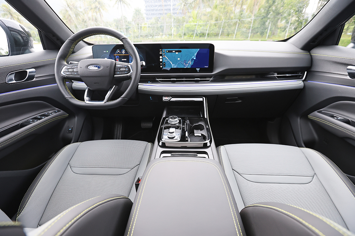 Territory的車艙採水平式的控台設計,並走大器簡潔的風格路線,此外包括控台、中央鞍座以及前後門飾板等處,皆包覆軟質塑料再搭配皮革以及鍍鉻金屬件與黑色鋼琴烤漆飾板等,尤其座椅更以PANGEA頂級真皮打造,讓整個車艙展現出高端的質感氛圍。尤其原廠強調,針對油電車型更加裝有專屬的雙色內裝套件,以晨曦灰/迷霧黑為基調,搭配Tech Matrix科技矩陣紋飾板以及特殊的Zest琉光綠縫線,透過運用現代且輕盈的和諧色調,再點綴清新的色彩於其中,帶來舒適自然又活潑的車艙氛圍。