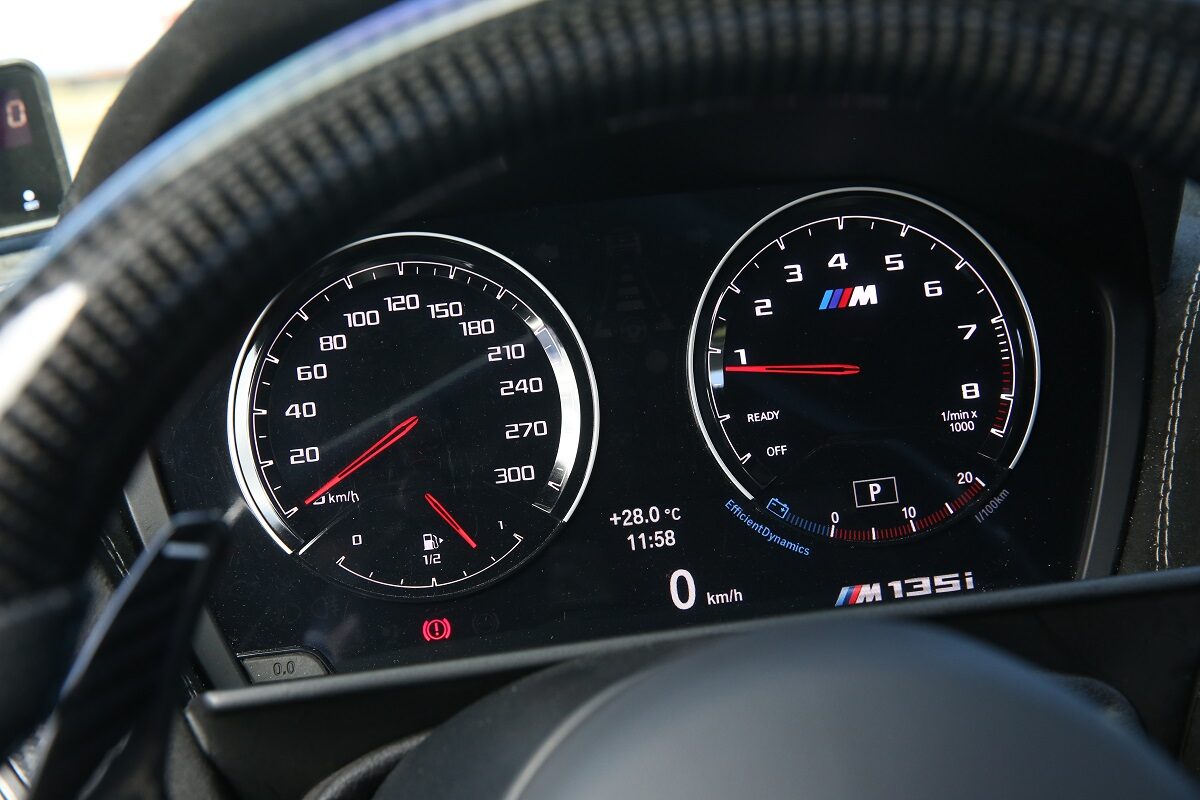 底盤部分的強化也著墨不少,包含Air Force全套四輪獨立氣壓避震器、20吋客製化雙片式鍛造輪圈與M5 400mm碟盤+前六後四卡鉗等,都是用來強化視覺張力的有效套件。內裝部分,除了可以看到全車安全帶都已更換為藍色式樣外,儀錶板也更換成M2原廠部品,高達300km/h的時速錶底,就已充分說明不凡的性能表現,當然碳纖維材質的方向盤與Top Gauge渦輪錶,對於提昇車內戰鬥氣息也有的明顯的幫助。整體來說,這部車主在車主努力堅持改造下,在筆者心中堪稱是國內最完整改的一部M135i,也在國內外改裝界中,掀起不少話題。