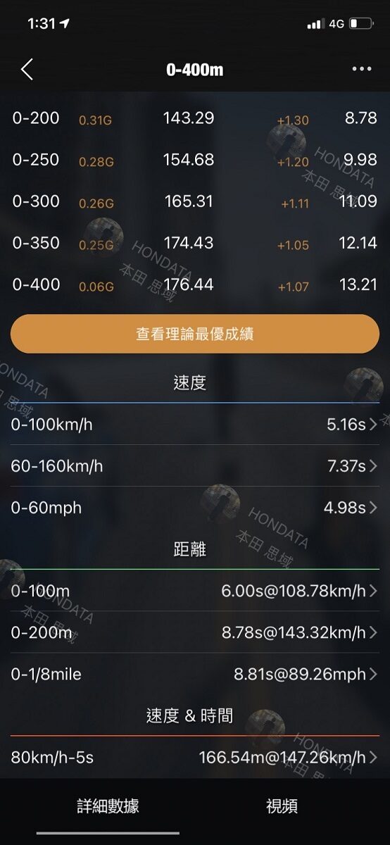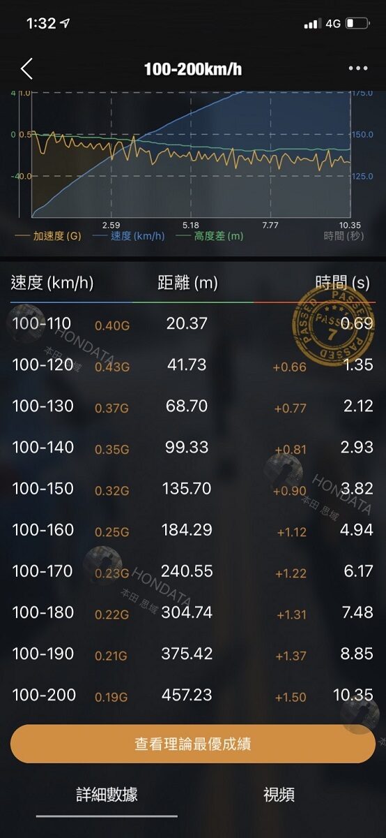 而經過增壓套件加持後,在引擎內部都未經過強化,且凸輪軸也沒有更換高角度部品下,使得這部車的最大馬力預估可以到340-350hp,加上車主進行了拆除後座與車體鈑件輕量化的工程下,整體加速實力不俗,根據儀器實測相關成績為,0-100km/h:5.1秒、0-400m:13.2秒,通過末速:176.44km/h、100-200km/h:10.35秒,據車主表示3階改造的七代GTI、C63 AMG等車,在200km/h以下都不見得能跑得贏它,再次驗證K20A紅頭引擎的威名。