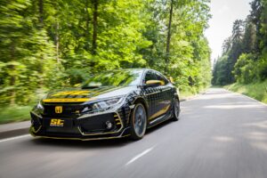 整部車所換裝的套件涵蓋範圍,包含有引擎蓋、前保桿、前下擾流、前後寬體葉子板、左右側裙、後下擾流與大型尾翼等。車頭部分的鈑件幾乎都換裝或加裝過,整個視覺感受跟原廠有很大的不同,改裝前保桿有著更大的氣壩開口外,開口的數量也增加很多,且每個開口都有其對應的散熱部位,有助於動力系統散熱之用。此外,碳纖維紋路的引擎蓋上,開孔數量也不少,除了左右兩套出氣孔外,中央還設有一進氣口,目的在灌入外界冷空氣到排氣頭段附近,使排氣高溫得以快速從車底排出,而向前延伸不少面積的前下擾流,也使得車頭正前方的氣勢獲得極高的加分作用。
