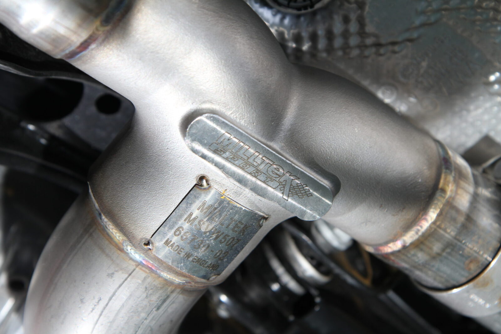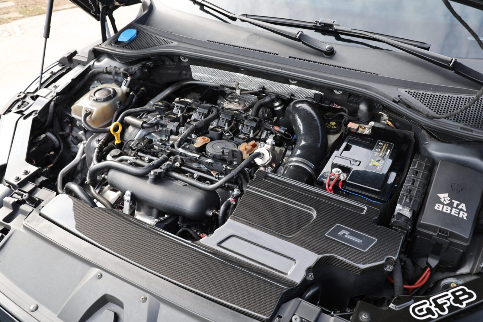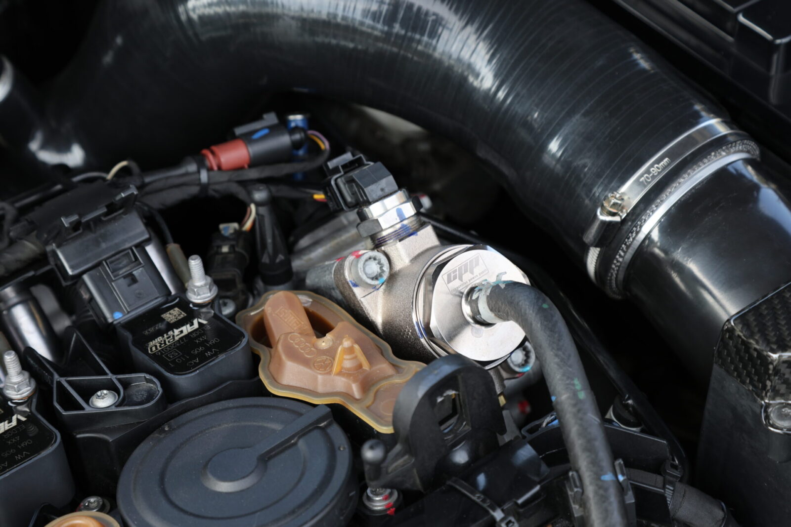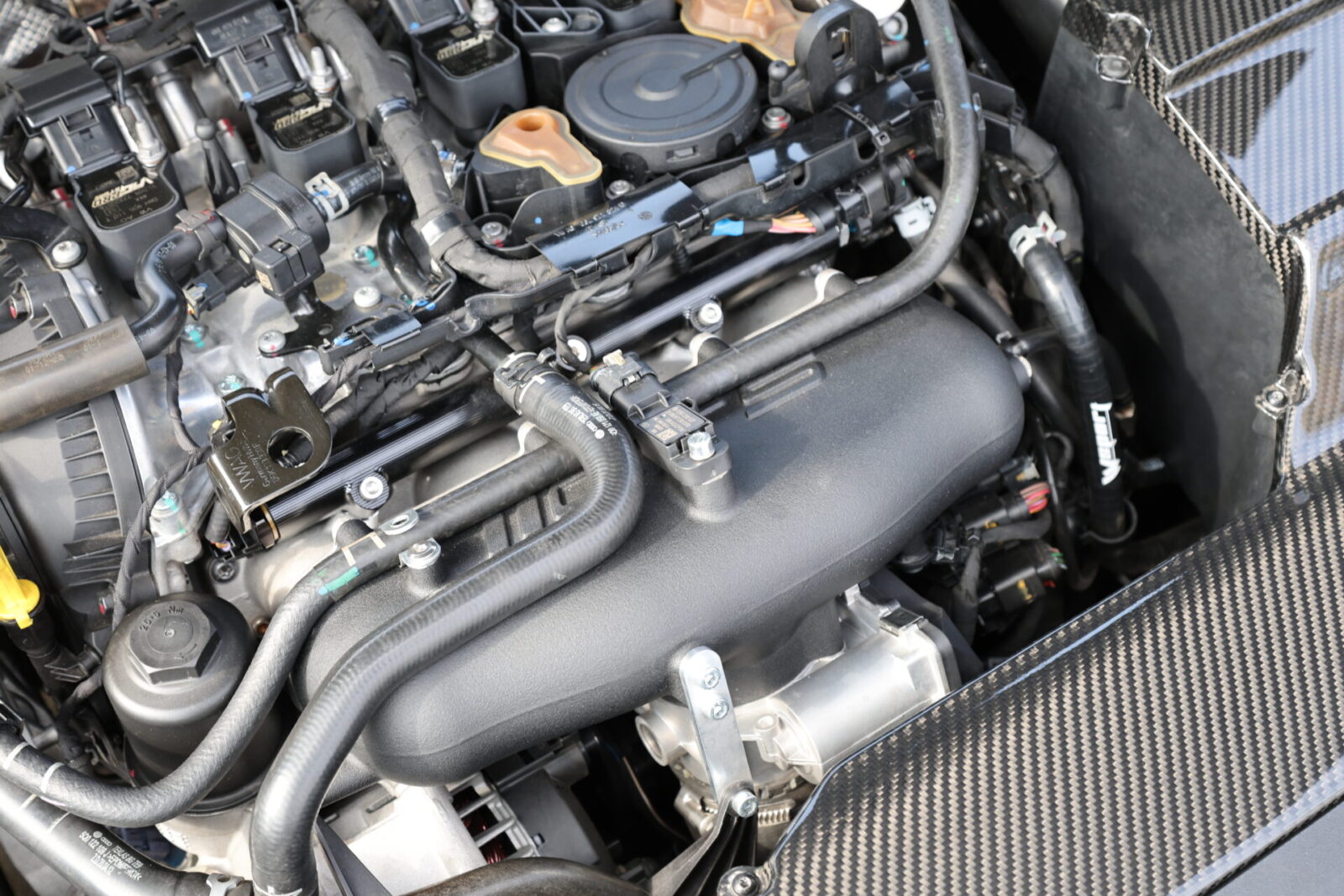 周邊套件部分,進氣系統採用包含有集氣箱的Racingline VWR R600碳纖維進氣組,該套件設有朝車頭前的畚箕型集氣罩,搭配高流量香菇頭與質感頗佳的整體設計,除了有效提升進氣量之外,也能美化引擎室的戰鬥氣息。排氣系統則是VAGPRO 89直通Down Pipe管,搭配Milltek全直通中尾段排氣管,可快速排出燃燒廢氣,以降低排氣管內的壓力。