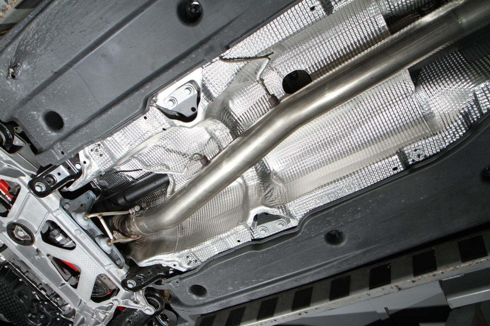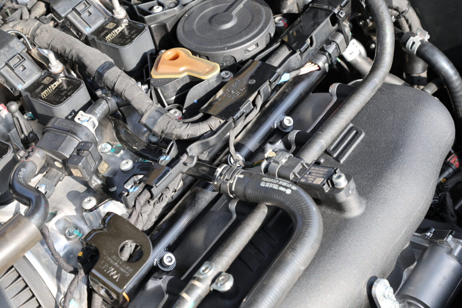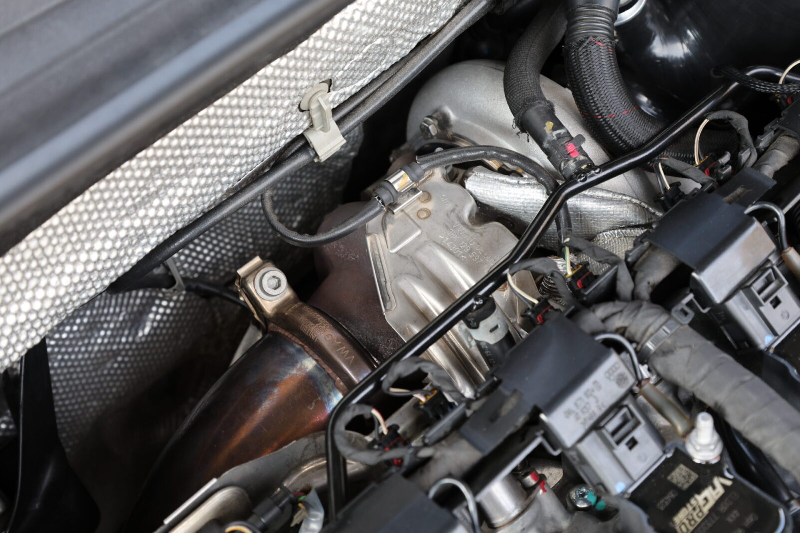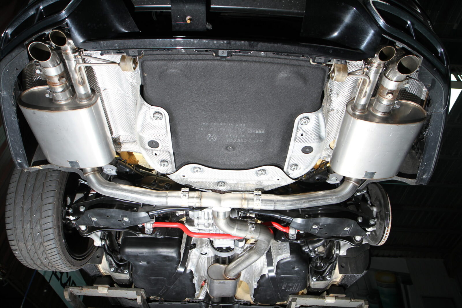 降低排壓的部分,在採訪時林木自動車也進一步說明,由於EA888的排氣頭段採用集成式排氣歧管,也就是過去裸露在外類似章魚腳的排氣歧管,改成整合在引擎汽缸頭內,使得排氣門與渦輪間的管路長度太短,在2.0bar以上的高增壓場合時,容易累積大量排氣壓力在排氣歧管內,如果不適度疏通排壓,就會導致排溫過高,甚至讓高熱的排廢氣倒灌至引擎內,對引擎的壽命與效率都會大大受到負面影響,因此高增壓渦輪引擎的排氣管,基本上都是採用全直通無觸媒的設定,如此才能件可能減少排氣壓力阻塞的問題。