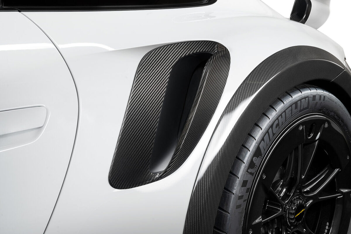 另外,重新設計的後保桿有很大一部分採用黑色塗裝,並與碳纖維飾板以及氣流擴散器相搭配,而不銹鋼排氣系統的出口,相較於原廠排氣管,則稍微往中間移動,並附有閥門控制裝置,可隨情況啟閉閥門以確保不會吵到其他用路人。這組空力套件還通過風洞測試,測試結果發現,車頭的抬升力降低了,可在140 km/h時降低45%抬升力,同時讓車尾的下壓力增加4倍,對於提高車尾過彎極限有絕佳幫助,並優化流向中冷器的氣流,除了讓車身更穩定外,對於冷卻系統的強化也有明顯幫助。
