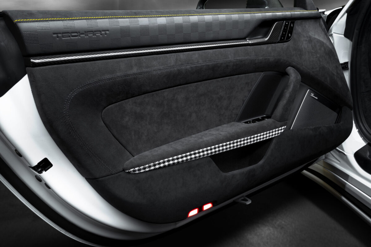 車側部分,GTstreet R Cabriolet前葉子板上也配備了類似GT3/GT2 RS的鯊魚鰓,還配備了碳纖維輪拱和車側進氣口集風罩。車尾則將992 Turbo S原廠尾翼更換為TechArt推出的大型碳纖維尾翼,並且保留原廠自動升降功能,在高速時可以升起高度,以獲得更好的車尾下壓力效果。