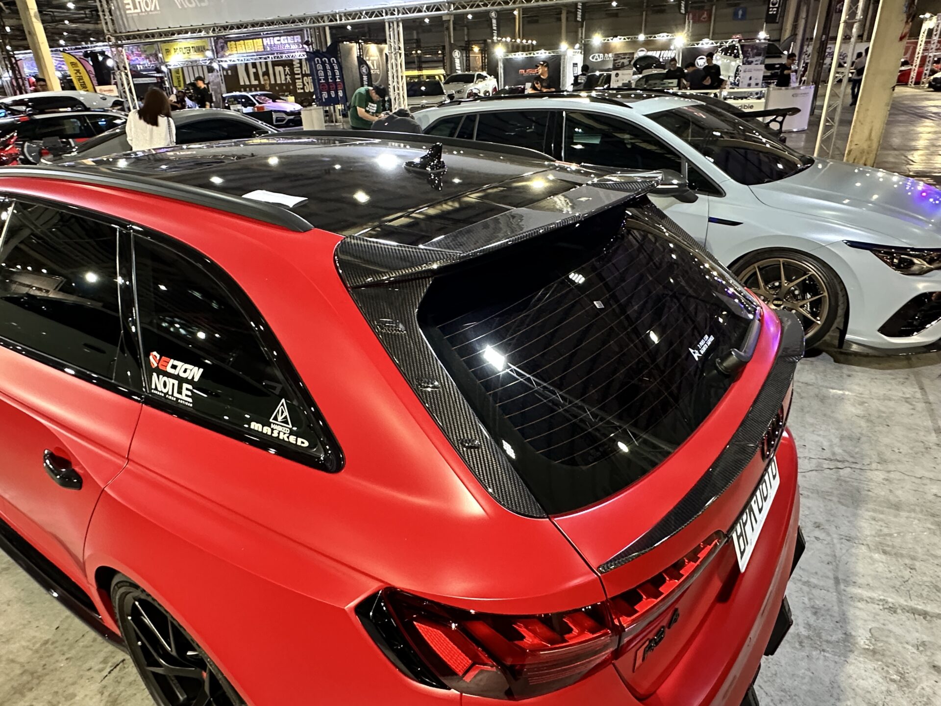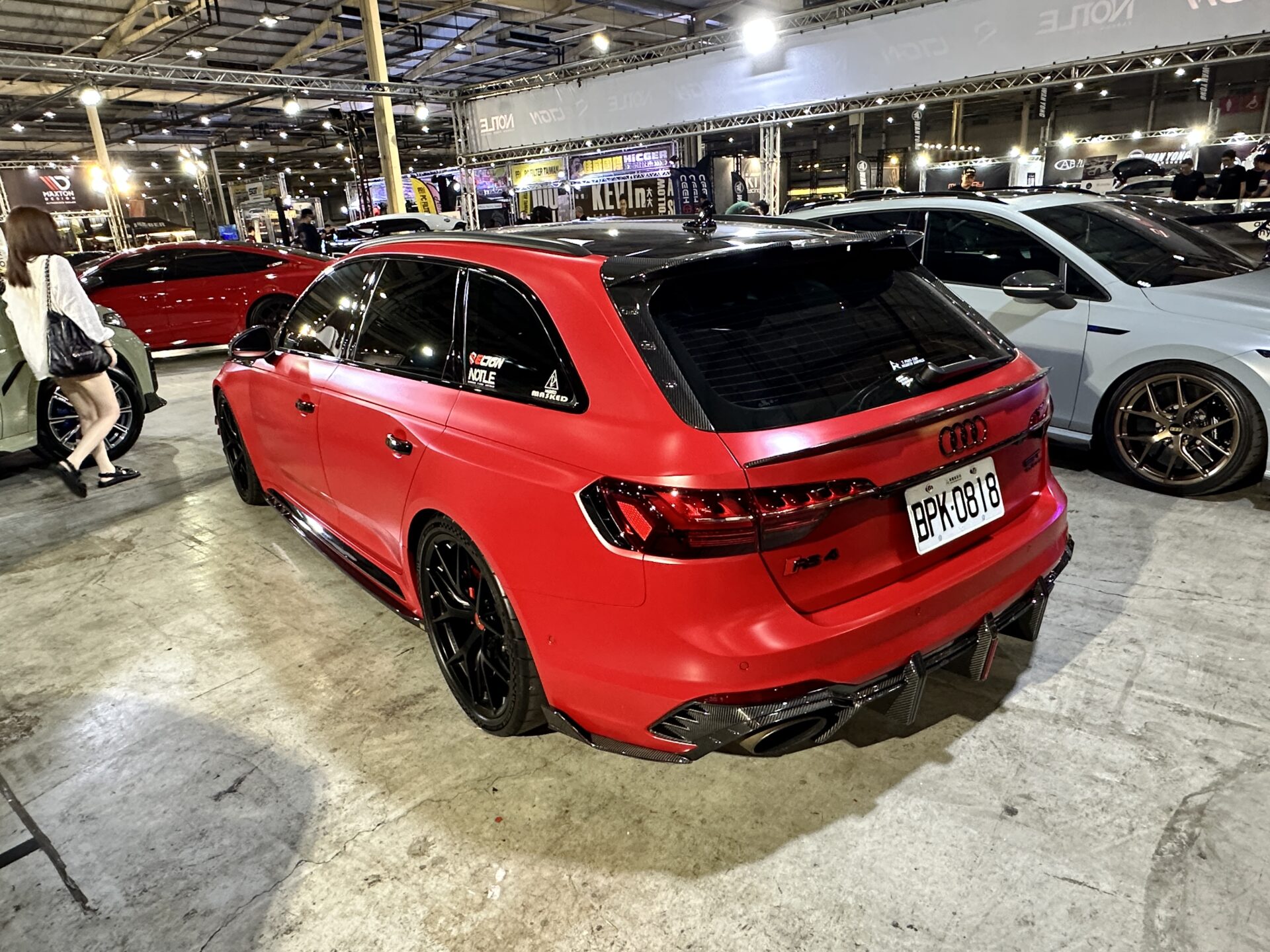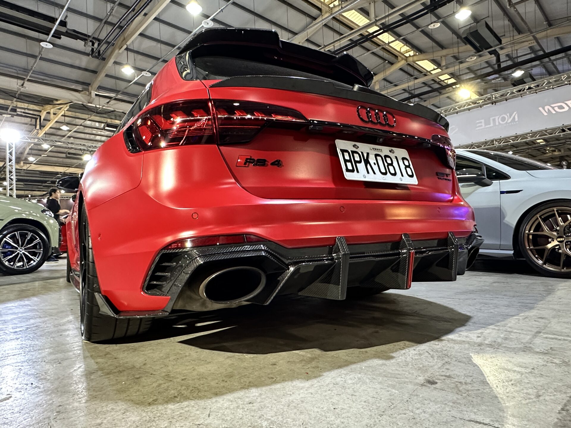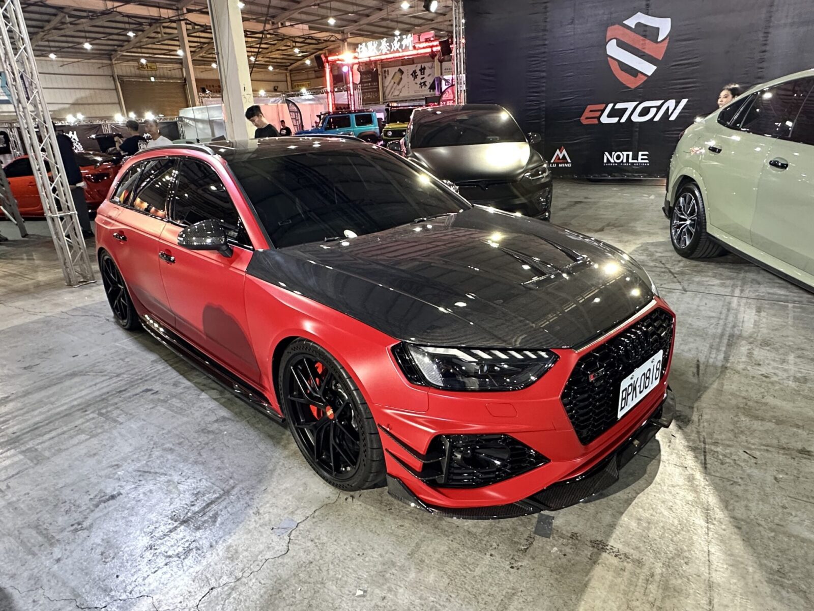 這部Audi RS4旅行車已換裝開孔引擎蓋、前後下擾流、前風刀、後上中尾翼,搭配碳纖維紋路與消光紅車色,整體氣勢相當霸氣。