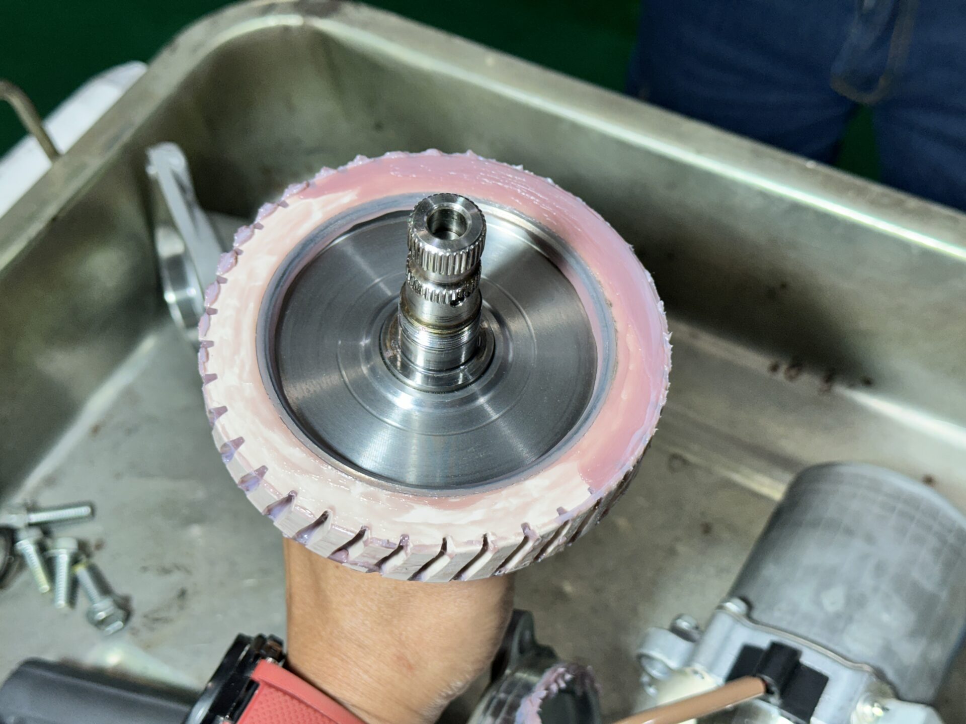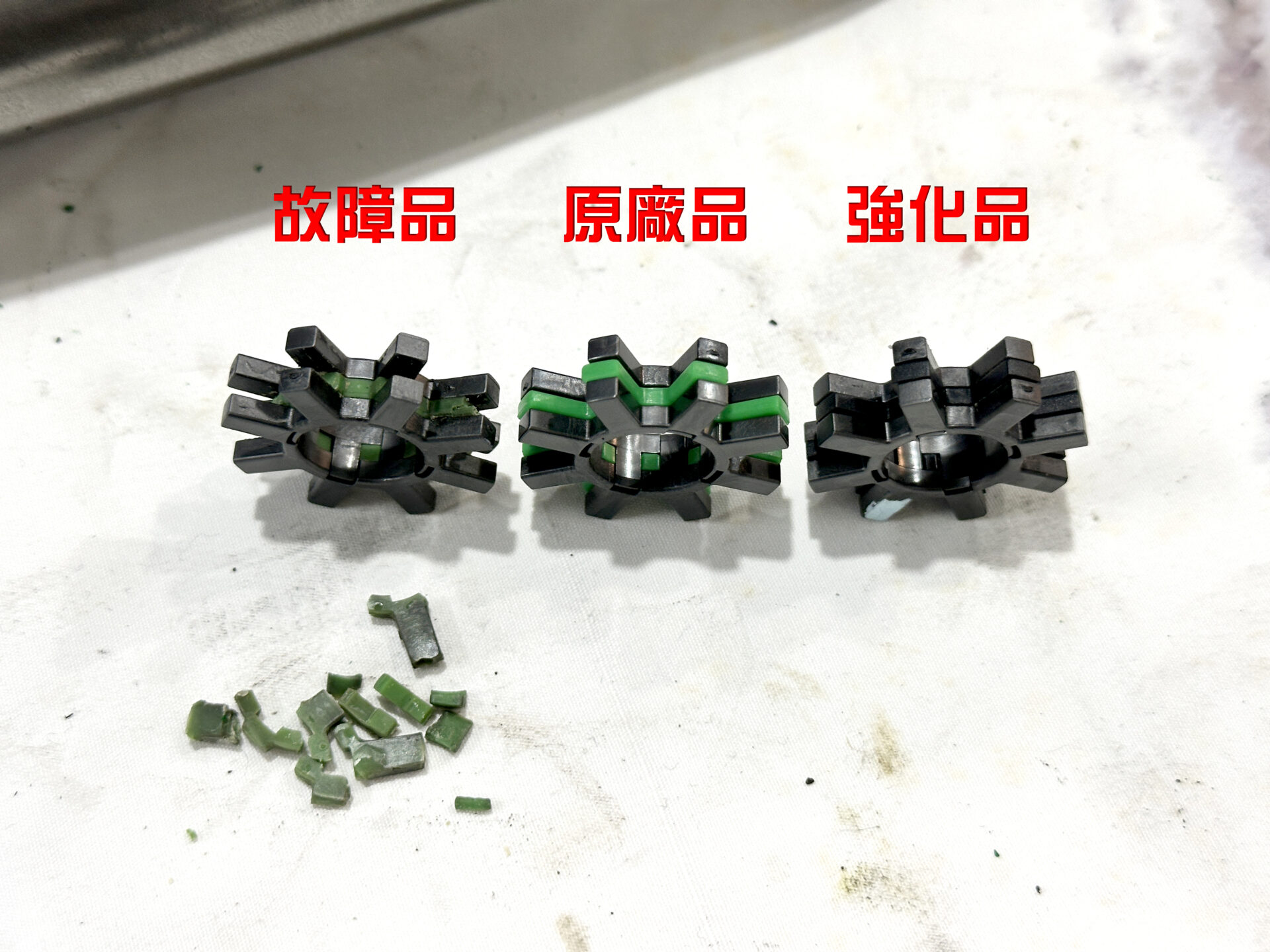 以Previa所使用的方向機來說,方向機內部的齒排與聯軸器(墊片)等,都是以強化品來進行取代的,齒排採用高強度合金鋼製作,聯軸器則將中央綠色的環保材質,更換為彈性更好的高耐用度材質,因此技勇再生過的方向機,其使用壽命與耐用度,不會比原廠新品差,這也是為何他們敢針對再生品推出一年保固的服務。