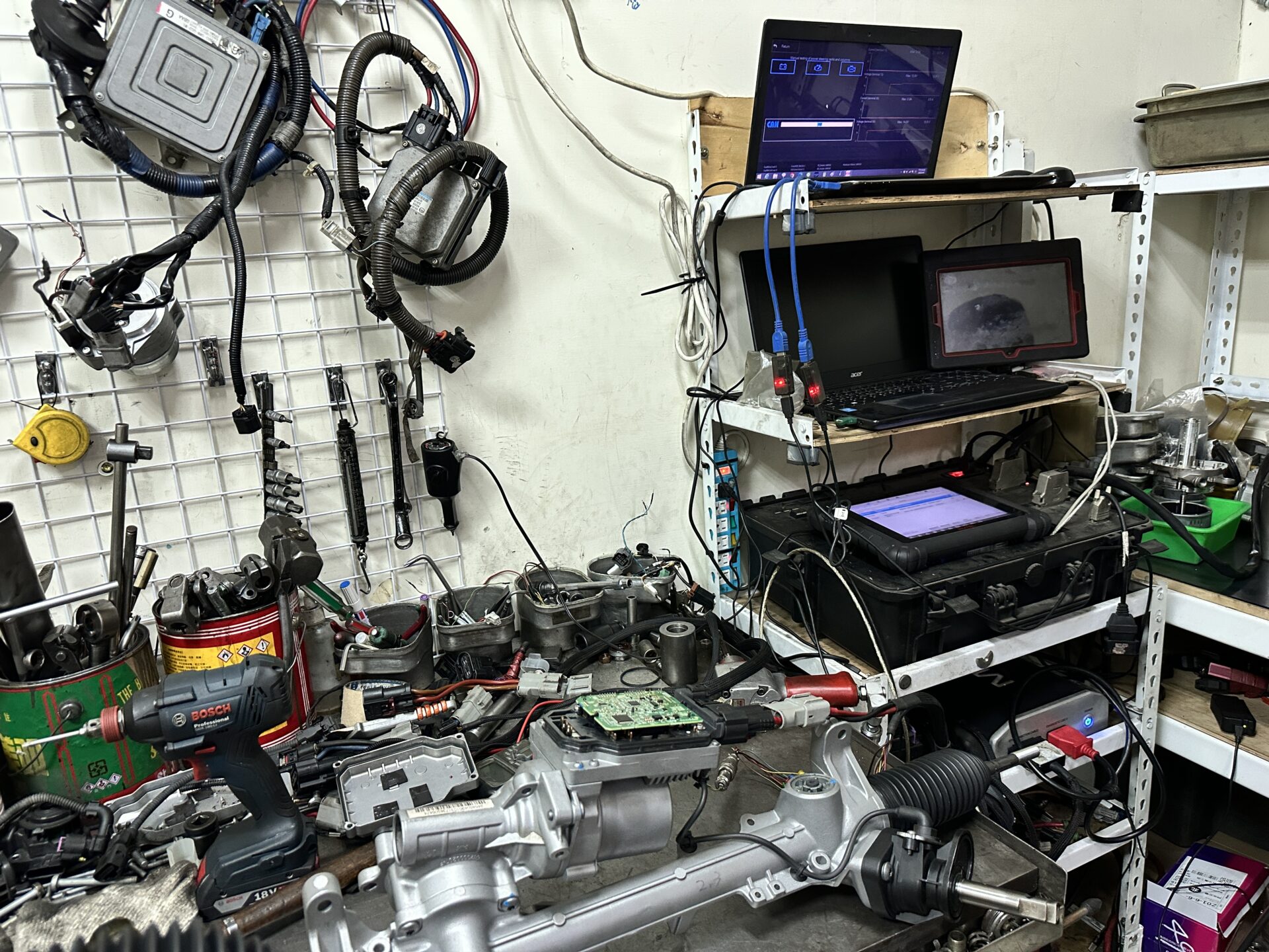 而這些原本不歸屬於傳統方向機維修範圍的電子領域問題,技勇也在好幾年前就開始涉略,同時購入整套的「診斷儀器」與「模擬測試平台」,可以找出控制模組電路板中哪個元件出現問題,並於換掉故障元件後,先進行桌上模擬測試,確定方向機正常運作後,再實際裝上車進行道路測試,確定都正常運作後,才會把車輛交給客人。