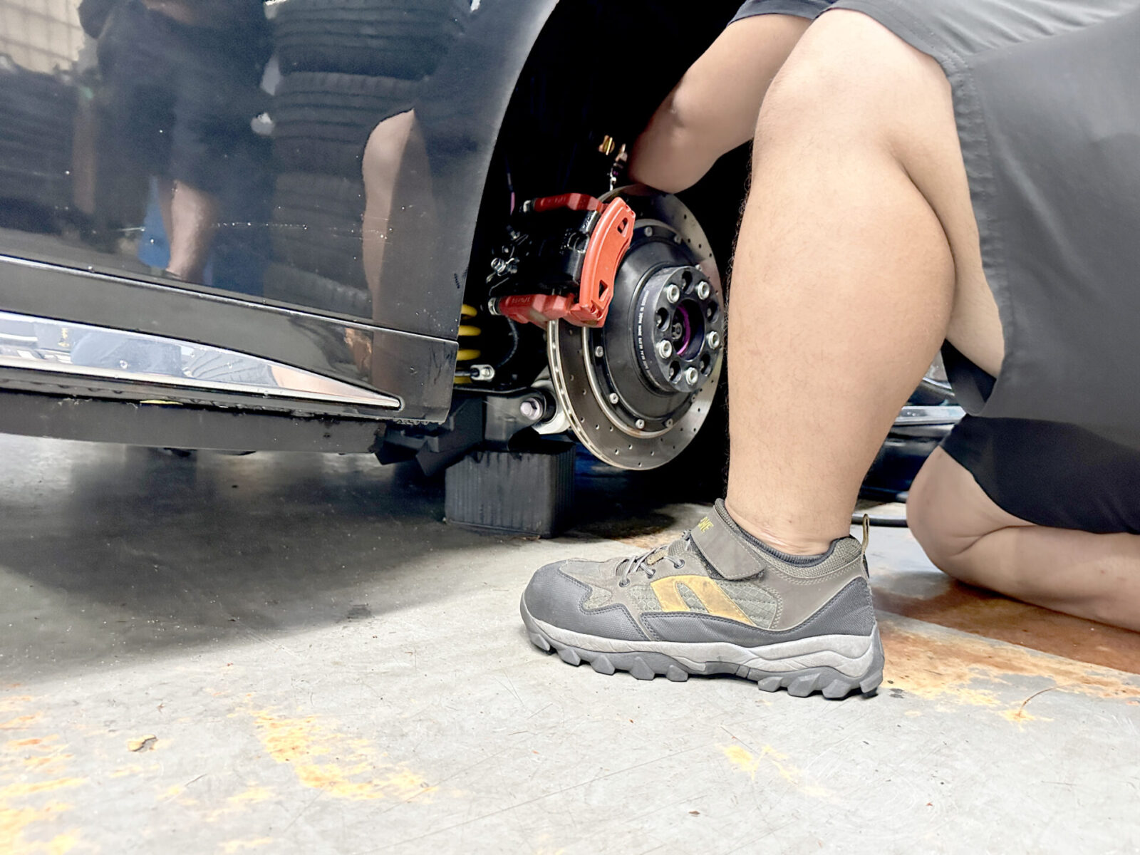 更換前負責施工的台中歐美輪胎也依照SOP,測量四輪弧到輪圈下緣的高度,發現前輪高度約為71.7公分,後輪高度約為74.7公分,接著開始更換KW V3避震器,完工後可將前後軸車高分別降低到66.7/69.0公分,降低幅度達5.0/5.7公分,用肉眼看就可得知車身高度確實降低不少。