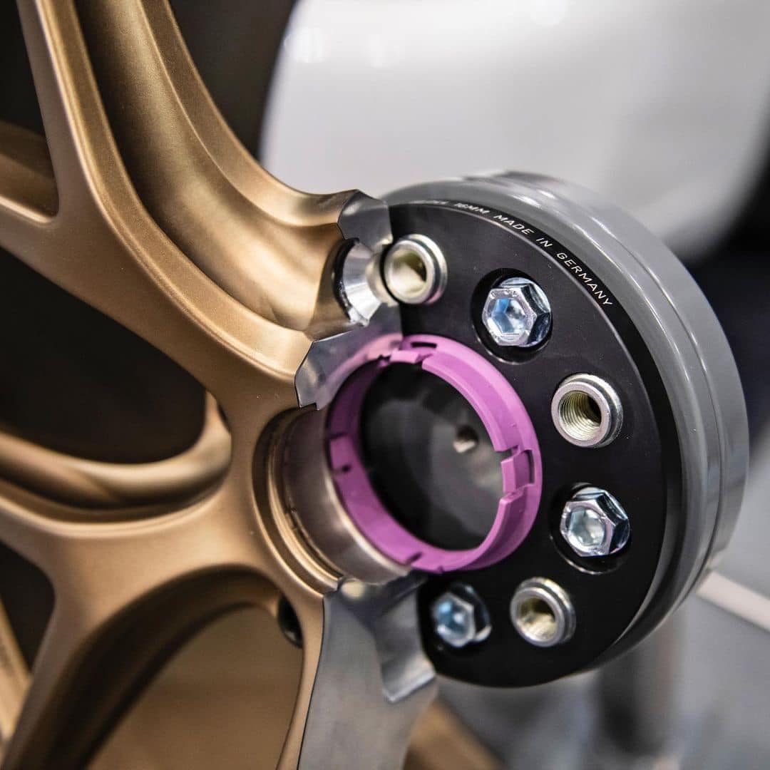 會這樣設定,最主要的目的是讓大家換車不用換輪圈。BBS Unlimited的PCD值都是5孔x117.5的規格,安裝時會依據不同車輛輪軸規格,搭配不同的德國BBS製造專用轉接座,可對應4×100~5×130內的所有輪軸規格,轉接座厚度也從14mm~50mm不等,之所以要這樣設定,目的就是透過轉接座這個零件,讓同一顆BBS Unlimited輪圈能裝到不同輪軸規格的車上,日後換車只要換輪距墊片,就可以換到別台車上使用,9成以上的5孔輪圈車型都能對應。而PCD之所以採用117.5而不是其他數值,主因在於德國原廠有計算過,此數值在轉接不同HUB PCD規格時,可以使上面10個螺絲孔(正反面)的間隔距離,錯開到最大程度,不會讓螺絲孔之間太接近,太接近可能會影響到轉接座的強度與鎖緊後的平整度,也就是才不會變形。