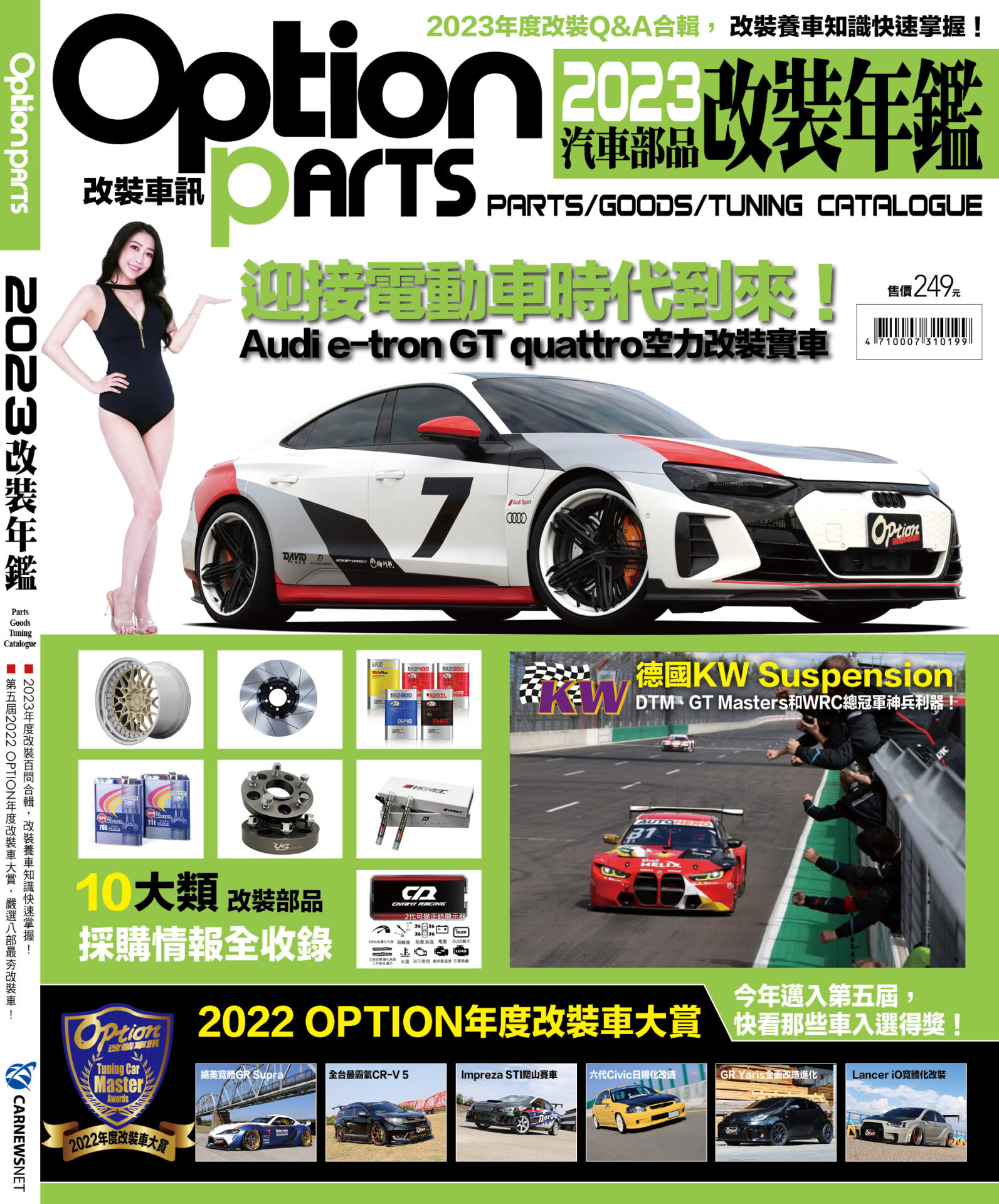 2023改裝年鑑改裝年鑑從2002 年開始製作的OPTION 汽車部品改裝年鑑,至今已連續22 年不間斷的發行這版刊物,這本當初以介紹汽車改裝零配件為主的刊物,22 年後的我們,還是以這樣的精神與初衷,製作這本雜誌,讓讀者能快速獲得最新的改裝套件與知識,也讓品牌商能有一個紙本平台,完整呈現最棒的改裝產品給大家認識,讓車主與廠商都能各自獲得所需的資訊。