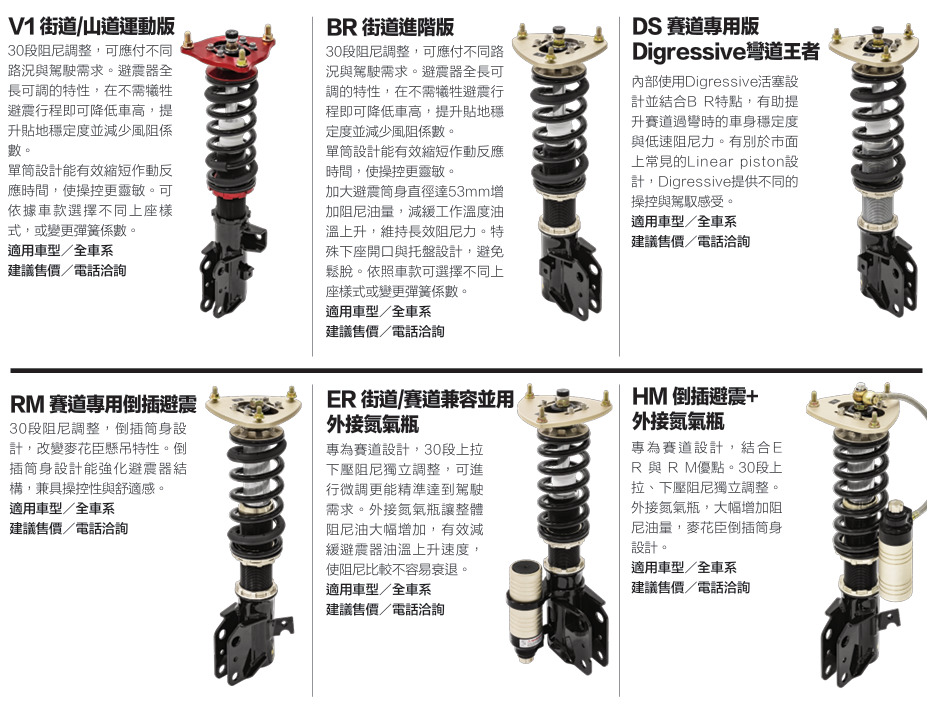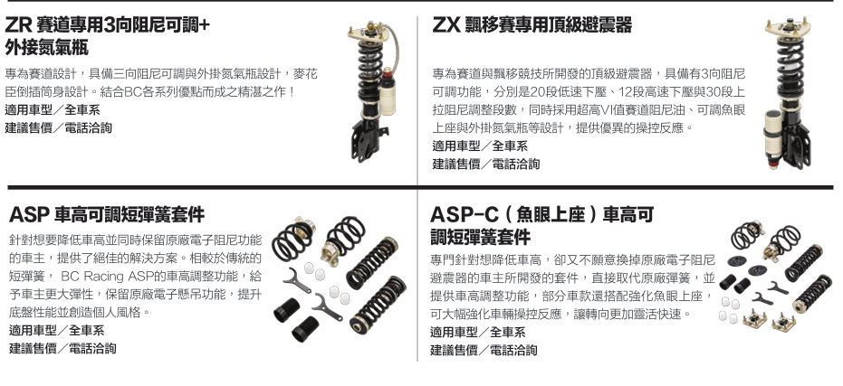 BC台灣柏釧企業股份有限公司創始於1999年,致力於專業改裝避震器的開發、設計與製造;多年來的專注發展與堅持高品質的製造理念,將BC避震器的優良品質介紹至世界各國。BC系列避震器以其30段阻尼可調及全長可調的特性深受全球汽車改裝市場喜愛,其創新設計能同時兼顧絕佳車身調整、卓越操控性能與乘坐舒適感;所有BC避震器皆在日本及美國通過各種路面測試與安裝準確度,確保行車安全與百分之百的安裝相容性。