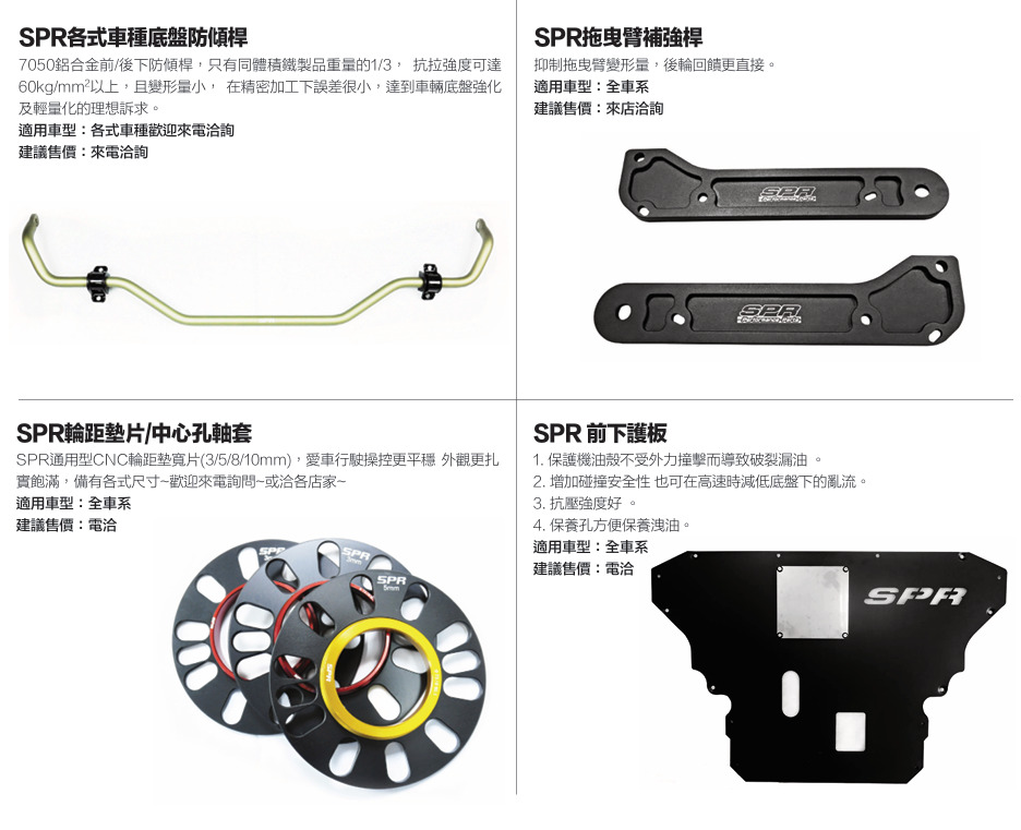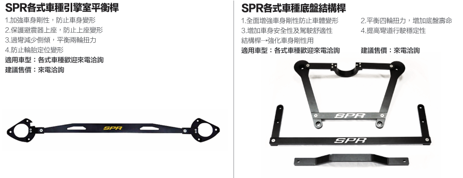 車身結構強化拉桿/防傾桿/鋁鈦合金配件/客製化訂作/專業設計/加工/製造。為了追求安全性,SPR在設計及製造程序上向來有所堅持。我們的防傾桿都是鍛造一體成型,結構件則是以螺絲做接點,減少焊接造成的結構損傷;SPR的產品是以鋁合金為主要材料,經過CNC精準加工,不只外觀簡潔優美、重量亦大幅減輕。
